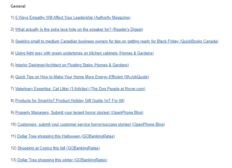 Here’s an example of a general HARO queries list: