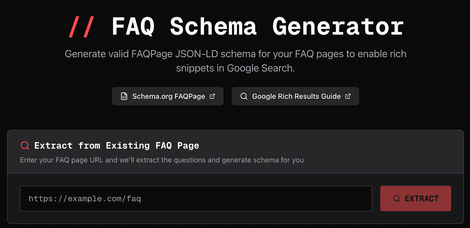 Here’s how you use it: go to the FAQ Schema Generator page, paste the URL of your existing FAQ page into the input, and run the generator. The tool extracts the FAQ questions and answers from the page and outputs valid FAQPage JSON-LD schema. This matters because it prevents the most common failure mode: schema that doesn’t match the visible content. If the tool pulls the content directly from your URL, you’re much less likely to mark up the wrong text.