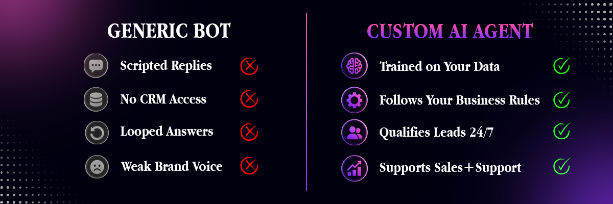 Generic bots lack the nuance of your brand. They cannot access your CRM, they don't know your specific return policies, and they often frustrate customers with looped answers. To succeed, you need a Custom AI Agent, trained specifically on your data, your tone of voice, and your business rules.
